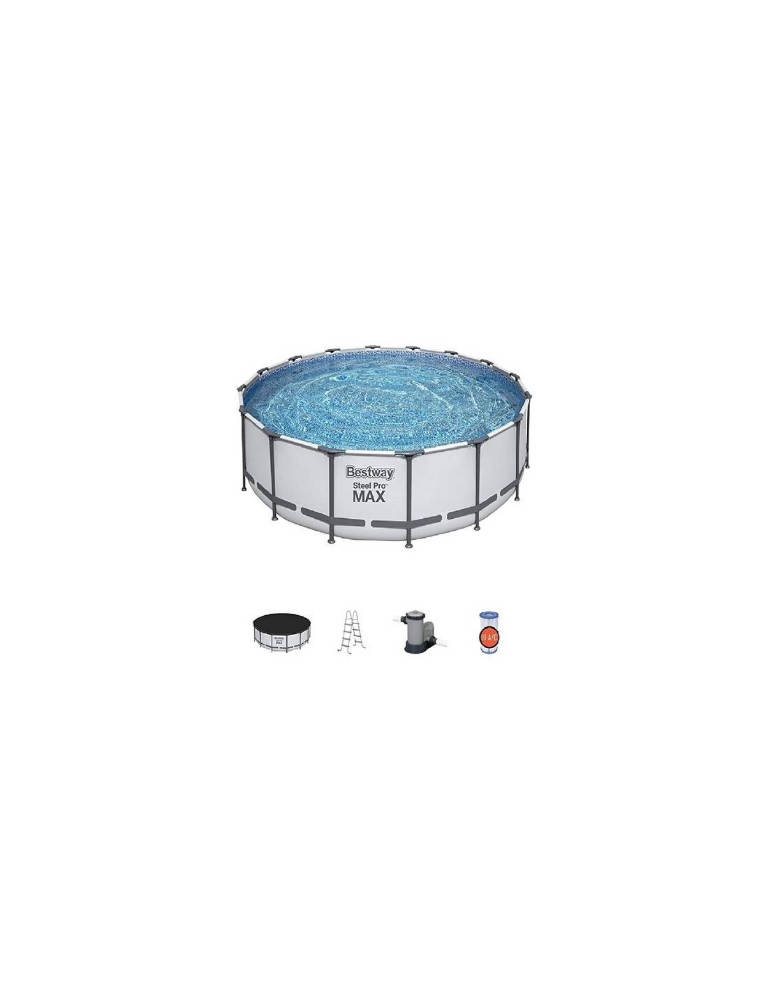 Piscina rotonda fuoriterra smontabile serie steelpro max, con pompa filtro a cartuccia, scaletta, liner grigio chiaro.