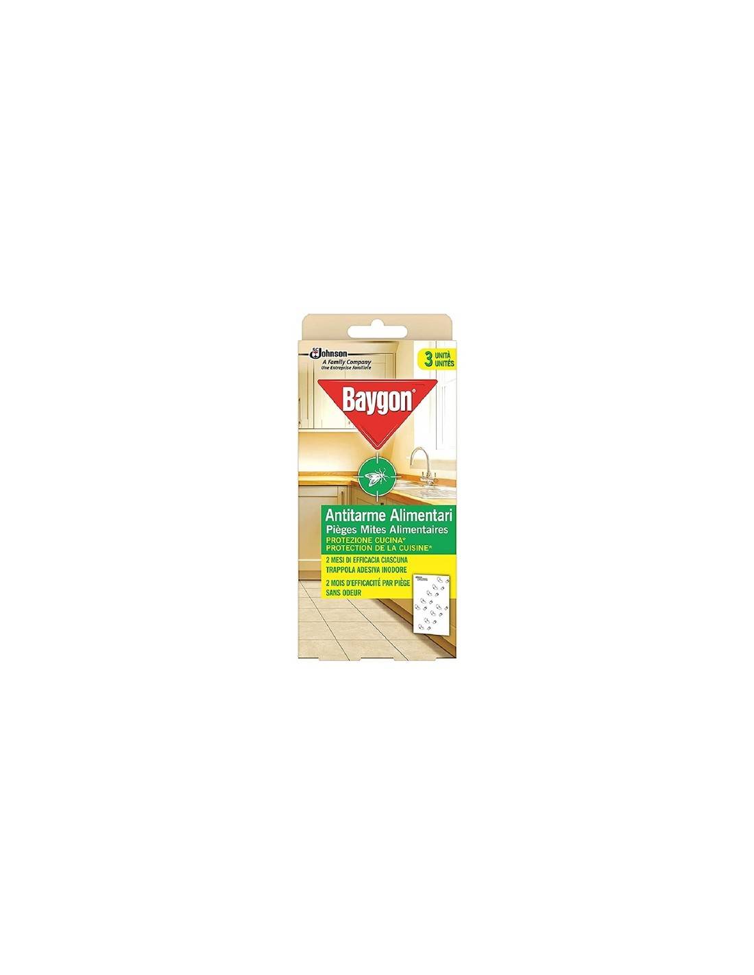 Baygon antitarme alimentari contiene un feromone che attrae il maschio delle tarme alimentari e lo intrappola grazie alla colla. In questo modo l'infestazione sarà riconosciuta al primo stadio.