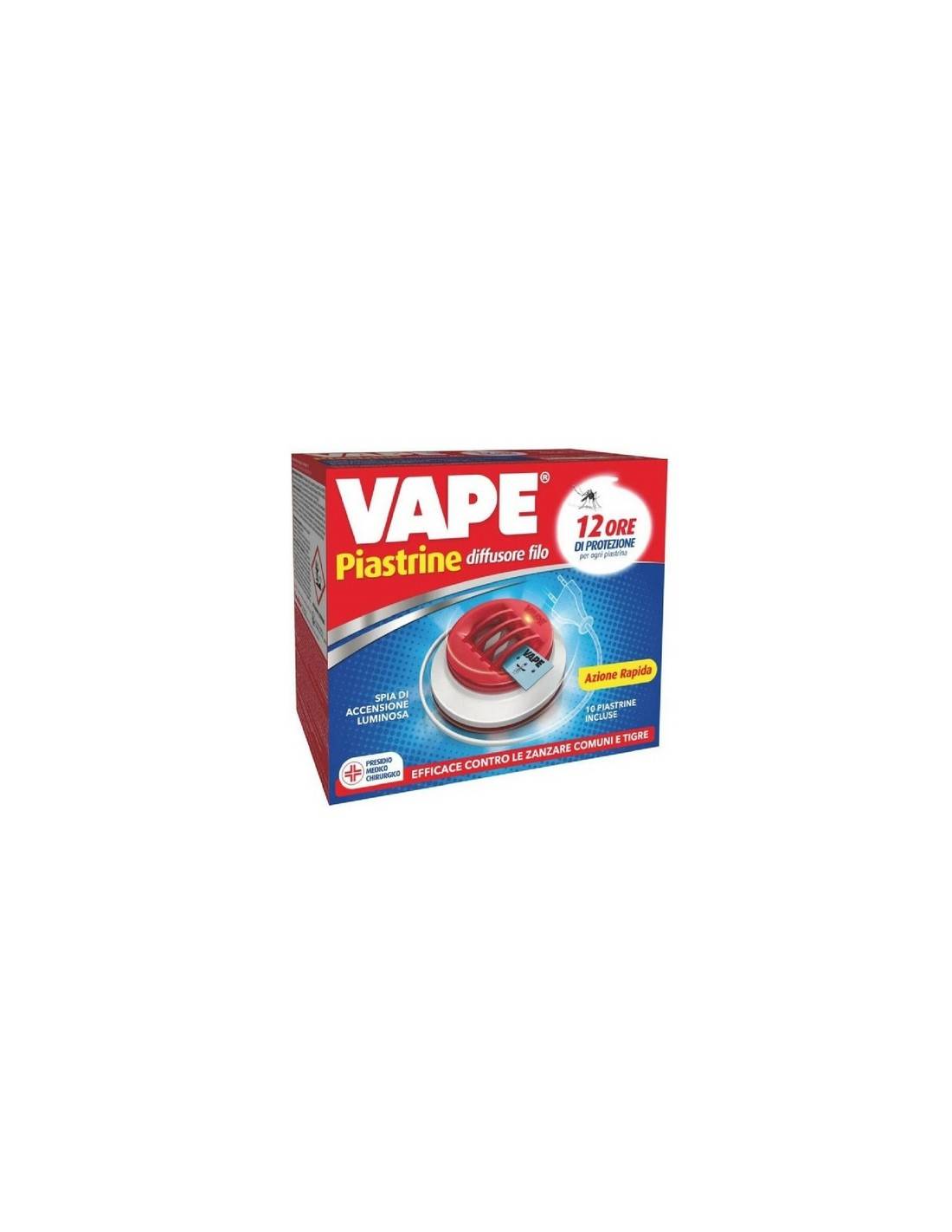 Vape diffusore di piastrine è uno elettroemanatore dotato di termistore, un componente elettronico che sostituisce la normale resistenza permettendo un'emanazione costante e controllata del principio attivo contenuto nelle piastrine Vape. Il controllo costante dell'evaporazione garantisce efficacia costante durante tutto il periodo di utilizzo. Il diffusore è dotato di filo per consentire di spostare l'apparecchio nel posto preferito nella stanza in cui viene utilizzato. Viene proposto con a 10 piastrine antizanzare, capaci di allontanare zanzare comuni e tigre per 12 ore a piastrina. Utilizzabile in casa e all'aperto.