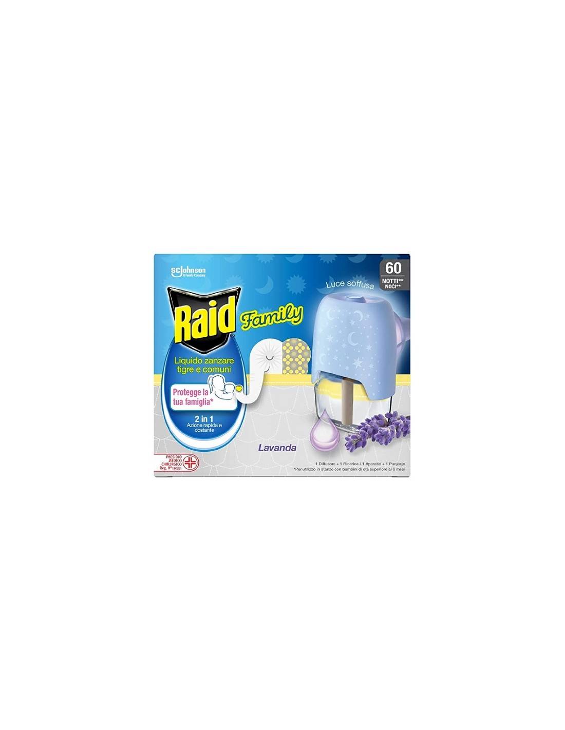 Raid Liquido Family offre 60 notti (8 ore per notte) di efficacia costante per tutta la notte contro le zanzare tigre (Aedes albopictus) e zanzare comuni (Culex pipiens), anche a finestre aperte e luci accese. Raid Liquido offre una protezione continua, discreta e inodore. Raid Liquido protegge una stanza di 20 m3. Fragranza alla lavanda.