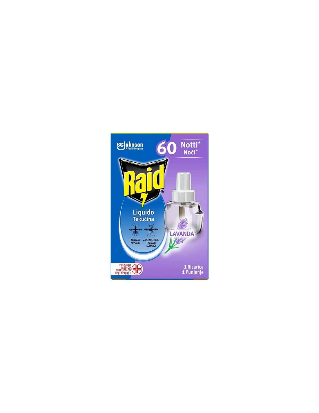 Raid Liquido Family offre 60 notti (8 ore per notte) di efficacia costante per tutta la notte contro le zanzare tigre (Aedes albopictus) e zanzare comuni (Culex pipiens), anche a finestre aperte e luci accese. Raid Liquido offre una protezione continua, discreta e inodore. Raid Liquido protegge una stanza di 20 m3. Fragranza alla lavanda.