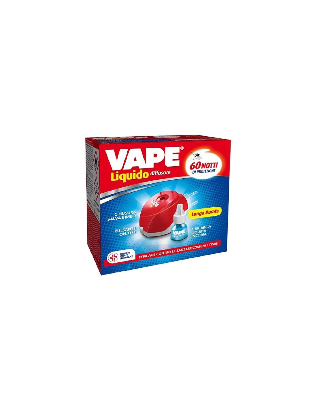 L'elettroemanatore liquido Vape è una soluzione definitiva al problema delle zanzare; grazie alla presenza del termistore multi-voltaggio e di uno speciale fusibile, il rilascio del principio attivo avviene in maniera costante e controllata, offrendo una protezione dalle zanzare comuni e tigre fino a 60 notti.