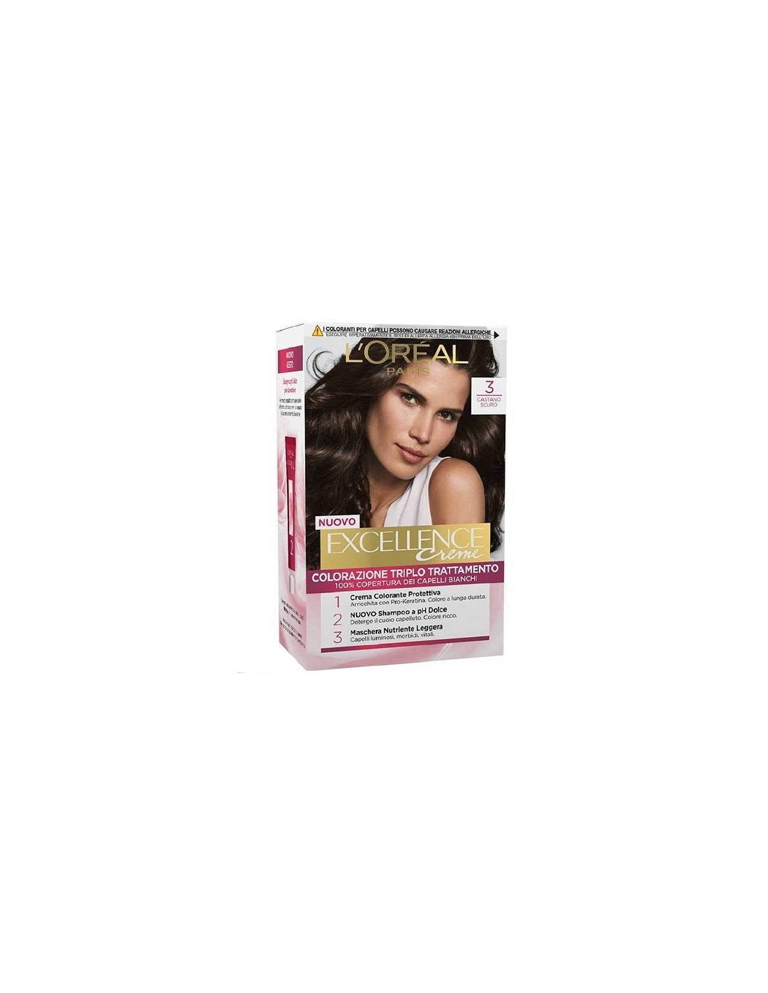 Scopri il triplo trattamento avanzato per un colore perfetto Una combinazione unica di potenti attivi per una protezione avanzata e un colore ricco, a lunga durata. La scienza della protezione La formula protettiva di Excellence Crème con Pro-Keratina e Ceramide è arricchita con Ionène G che entra in profondità all'interno della fibra capillare, per una protezione intensa a lunga durata. L'esperienza di una copertura perfetta La ricca crema protettiva avvolge generosamente i capelli, fibra a fibra, coprendo fino all'ultimo capello bianco. Il colore è perfettamente diffuso. Risultato: La copertura è perfetta, su tutti i capelli bianchi. Il colore è ricco, luminoso e a lunga durata. I capelli sono protetti, rinforzati, rivitalizzati a lungo grazie al trattamento intensivo che da oggi dura fino a 6 settimane. Se sei indecisa tra due nuance, scegli quella più chiara. In questa confezione troverai: Nuovo formato: 6 settimane di protezione intensa Preserva la bellezza del tuo colore fino a 6 settimane grazie al trattamento finale più generoso e riutilizzabile 1 - Il siero protettivo 2 - La crema colorante 3 - Il rivelatore 4 - Il trattamento finale La tua nuance è: 3 castano scuro