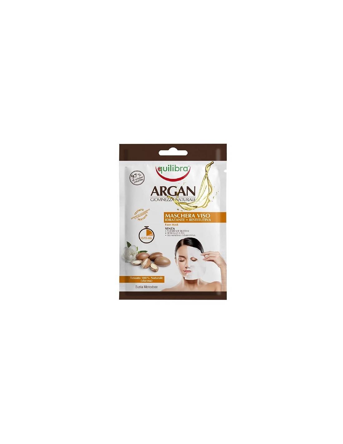E' una maschera in tessuto, 100% viscosa, studiata per idratare e rendere la pelle del viso rigenerata e donarle un incarnato fresco e radioso. A base di Olio di Argan, rende la pelle morbida, nutrita ed idratata grazie all'azione degli ingredienti naturali attivi presenti in formula. Arricchita con Acido Ialuronico e Olio di Avocado per idratare, elasticizzare e riequilibrare la pelle. Modalità d'uso: Aprire la busta monodose. Prelevare la maschera ed applicarla su tutto il viso pulito ed asciutto. Lasciare agire per circa 10-15 minuti. Rimuovere la maschera. Una volta rimossa la maschera, massaggiare per far assorbire l'eventuale prodotto in eccesso. Per un effetto beauty express tenere in posa 5 minuti. Per un trattamento completo prima di applicare la maschera, detergere il viso con Equilibra Argan Mousse Detergente Viso. Formato busta monodose.