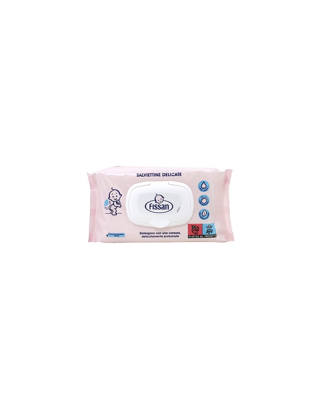 Fissan Baby Salviettine Delicate in morbido tessuto e arricchite con ingredienti benefici della Pasta di Fissan. Contengono una delicata lozione detergente per prendersi cura del sederino dei più piccoli ed aiutare a proteggere le pelli sensibili dalle irritazioni da pannolino.