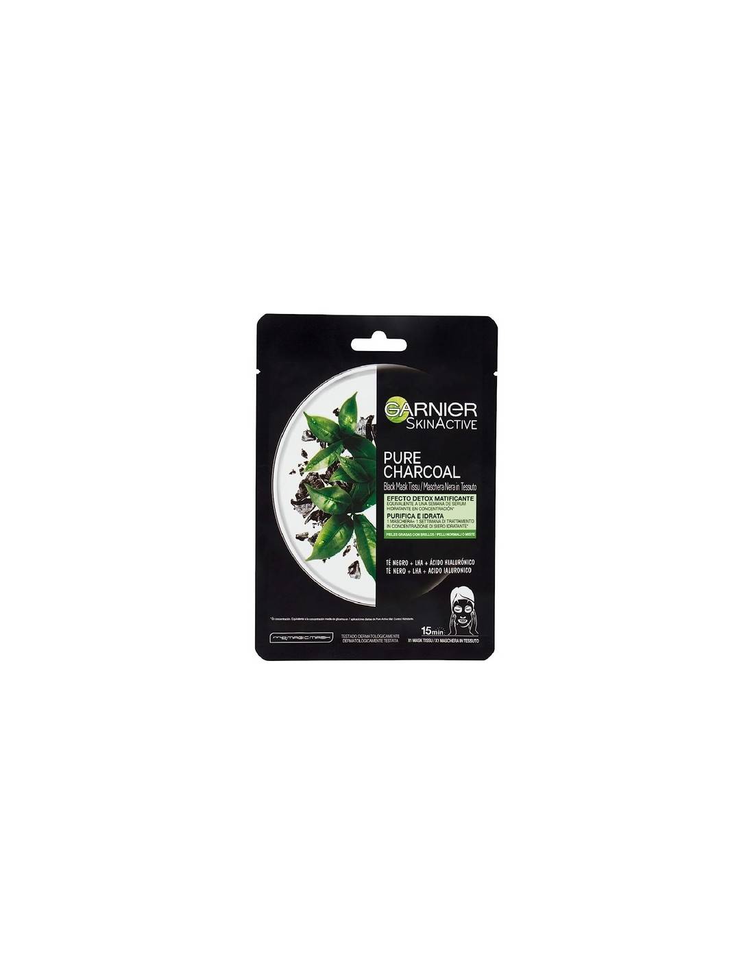 Maschera purificante e idratante - Effetto matte - Maschera in tessuto è infusa con carbone vegetale, noto per le sue proprieta' ultra assorbenti,ed e' arricchita con estratto di the nero, LHA e acido ialuronico per purificare, opacizzare e riequilibrare la pelle, lasciandola idratata.