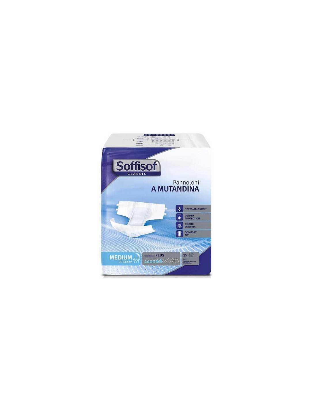 Soffisof Classic Pannolone a Mutandina con adesivi è un ausilio assorbente di forma anatomica composto da fluff di pura cellulosa, polimeri superassorbenti e uno strato esterno impermeabile per garantirti la massima sicurezza contro tutti i tipi di perdite. I pratici adesivi di fissaggio riposizionabili rendono questa protezione simile a una classica mutandina. Il nuovo design è stato studiato per garantirti il massimo comfort. L’indicatore di umidità a scomparsa graduale suggerisce facilmente il momento del cambio.