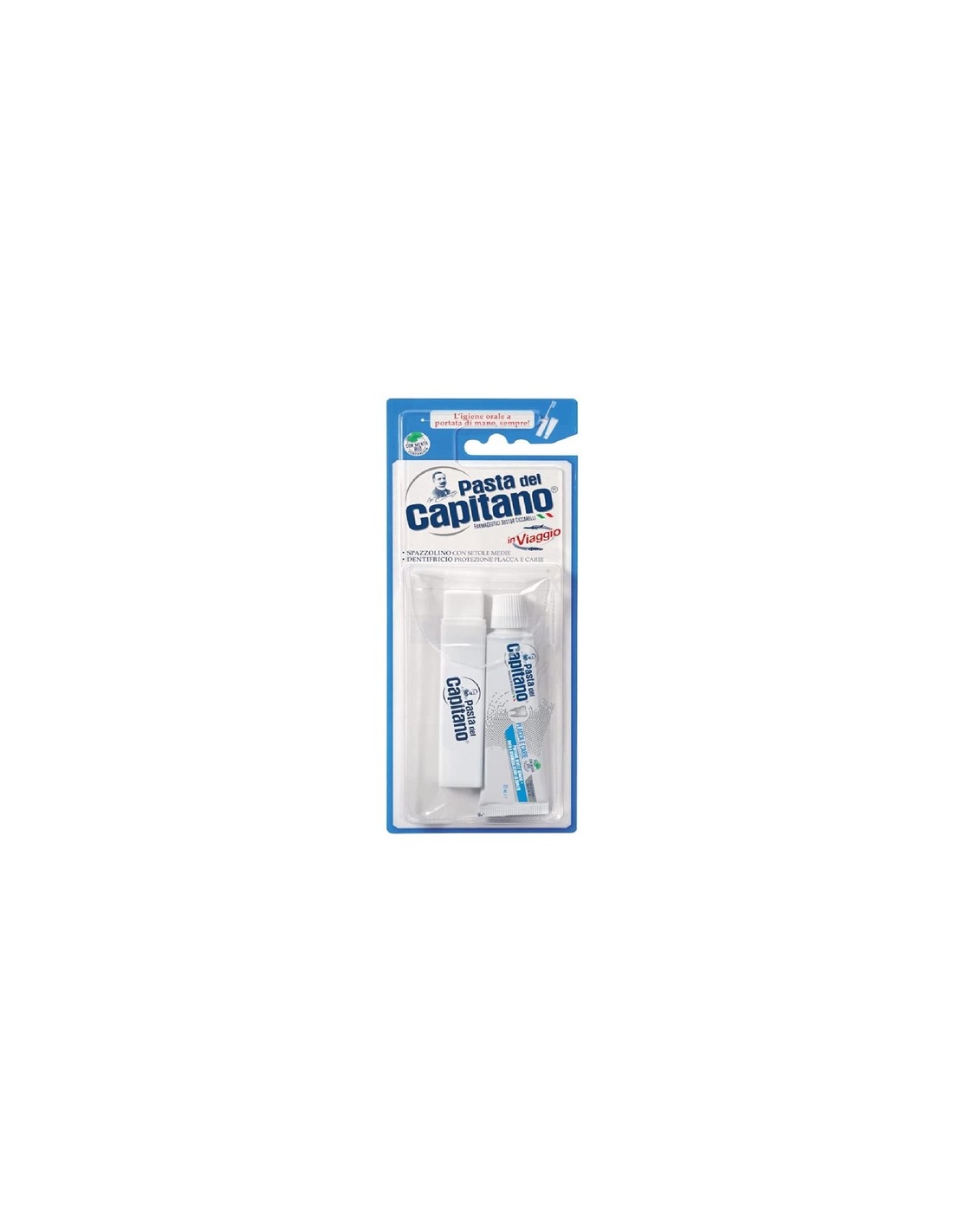 Pasta Capitano Kit Viaggio Dentifricio + Spazzolino Setole Medie-Kit Viaggio è composto da un dentifricio Protezione Placca e Carie da 25 ml e da uno spazzolino pieghevole con setole in Tynex, di gradazione media a punte arrotondate, il tutto in una pratica custodia trasparente. E' ideale per una corretta igiene orale anche in viaggio, a scuola o al lavoro.