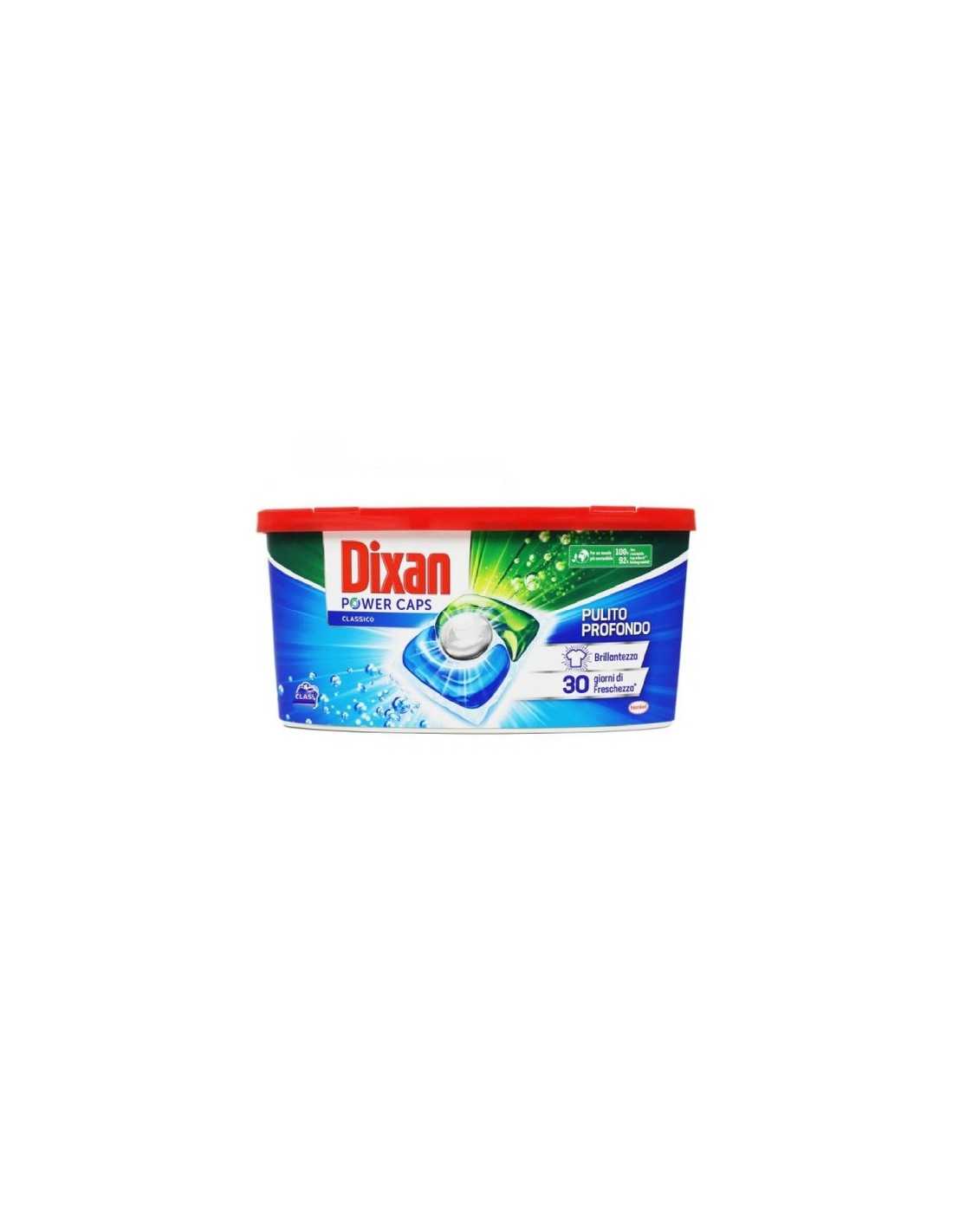 Detersivo Power caps Dixan Classico per lavatrice. Realizzato con la nuova tecnologia Pulito Profondo che ha cura dei tuoi capi. Azione pulente attiva delicato sui capi. Lava, smacchia e dona brillantezza e sono particolarmente indicate per il bucato. Ideale per il bucato colorato di tutti i giorni. Confezione da 18 Capsule.