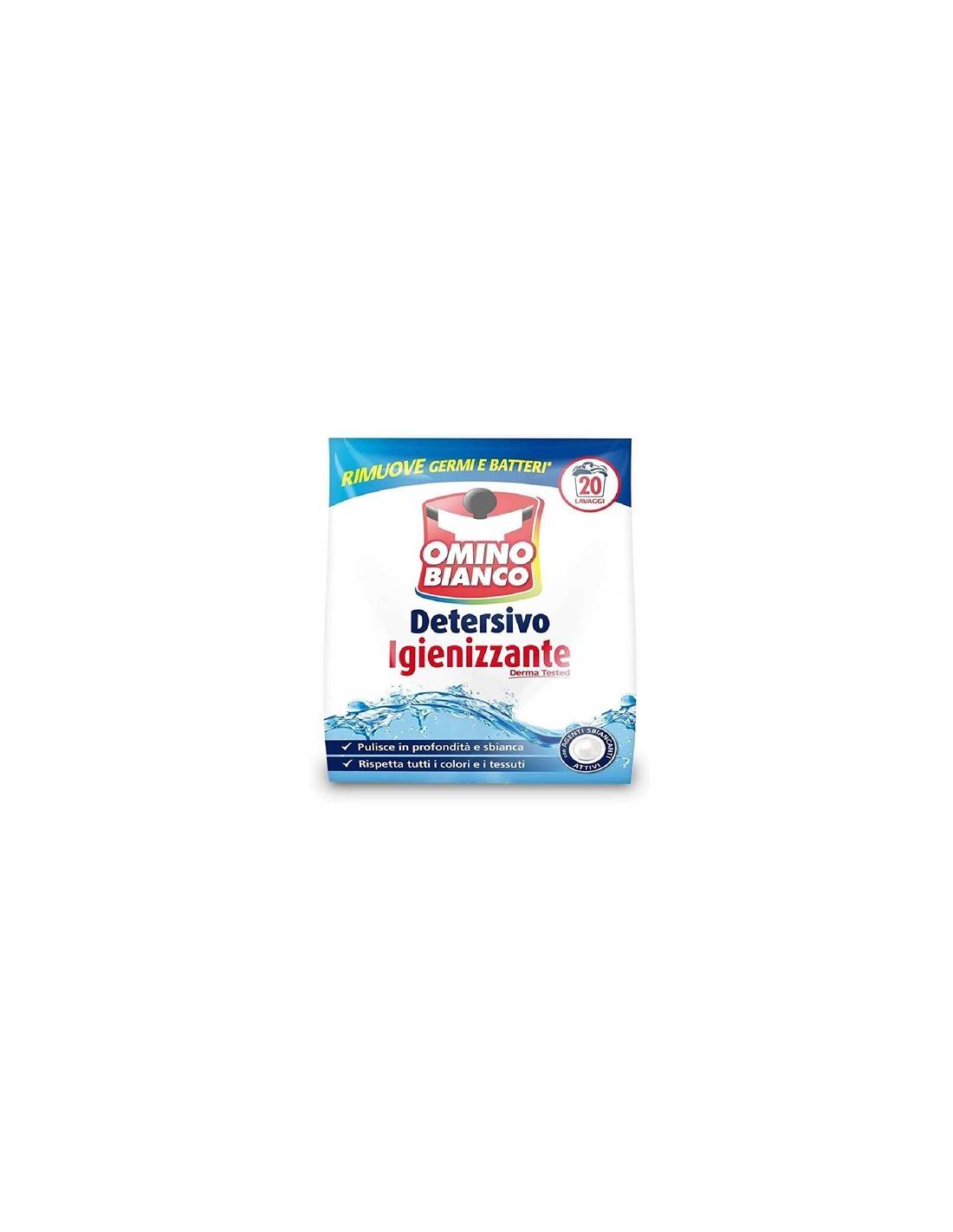 Omino Bianco Detersivo Polvere 20 Misurini 1100 Gr. Omino Bianco Detersivo Igienizzante grazie alla sua nuova formula in polvere pulisce i capi in profondità e rimuove germi e batteri.