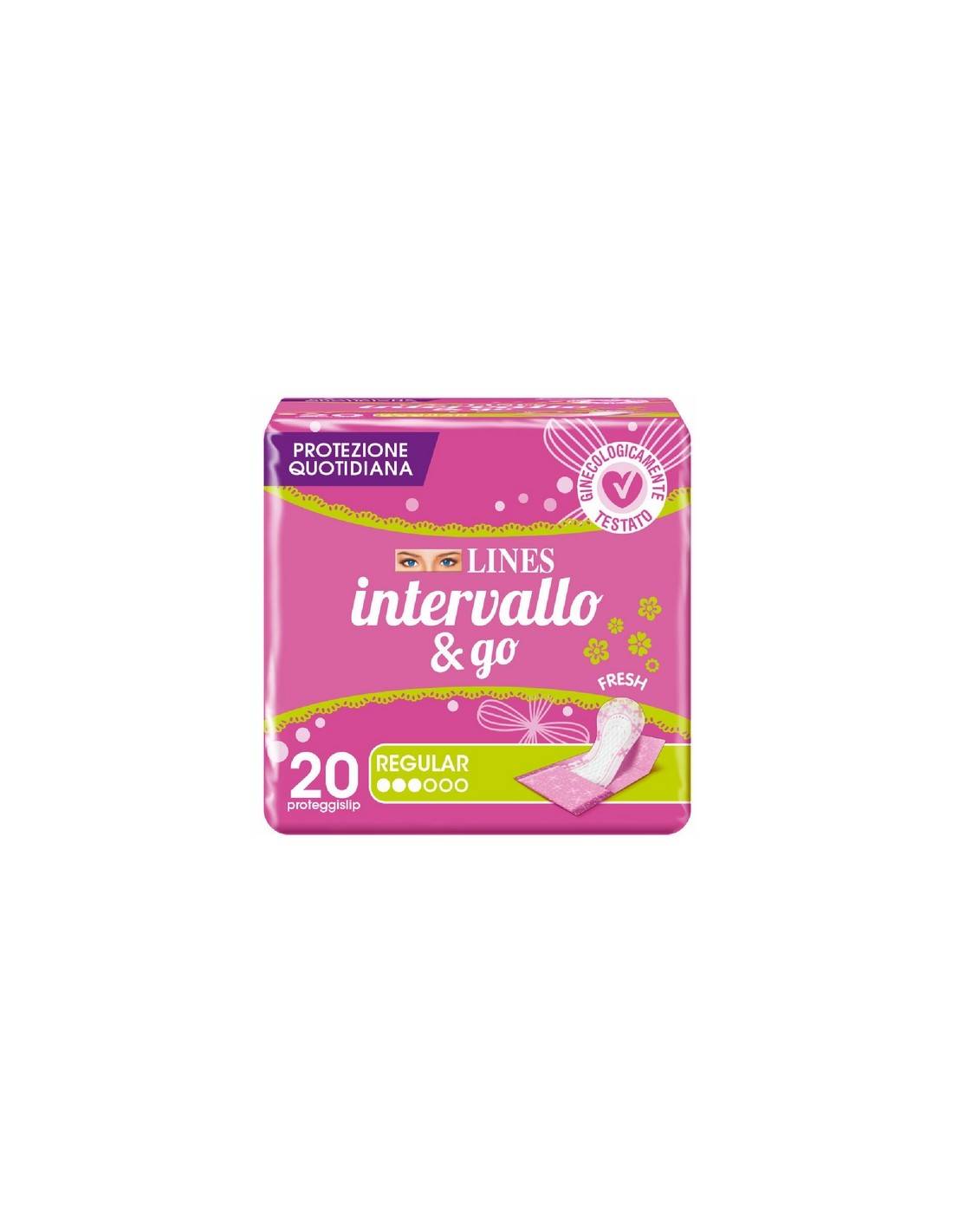 Lines Intervallo & GO è ipoallergenico e ginecologicamente testato. I prodotti sono ripiegati in singole bustine, così da poterli portare comodamente sempre con te. I prodotti della linea Intervallo sono studiati da LINES per rispondere alle diverse esigenze delle donne. Lines Intervallo & go, grazie alle perle superassorbenti ed alla zona assorbi-rapido, ti offre un asciutto incredibile senza rinunciare ad un sottile spessore. Il rivestimento traspirante ed il filtrante ricamato, ipoallergenico e dermatologicamente testato, sono studiati per garantirti il rispetto ed un contatto delicato con la pelle. Il sistema che controlla e neutralizza gli odori offre protezione e discrezione per sentirti sicura e a tuo agio con te stessa e con gli altri. Puoi scegliere di portarli sempre con te grazie alle comode bustine con sistema ad apertura facilitata. Prova anche la versione Fresh, arricchita con delicata essenza floreale, che ti dona una piacevole sensazione di freschezza.