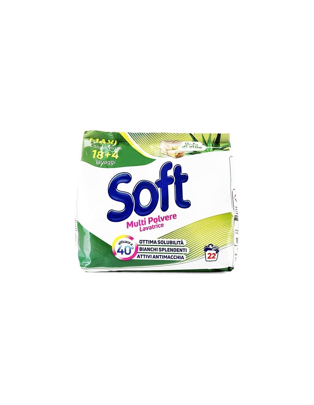 Nuova formula ottimizzata e potenziata piu` efficace sullo sporco. Soft polvere e` un formulato realizzato mediante un processo di atomizzazione in torre che permette di ottenere un prodotto rapidamente e altamente idrosolubile anche a basse temperature, rendendone massima la resa nella rimozione dello sporco.