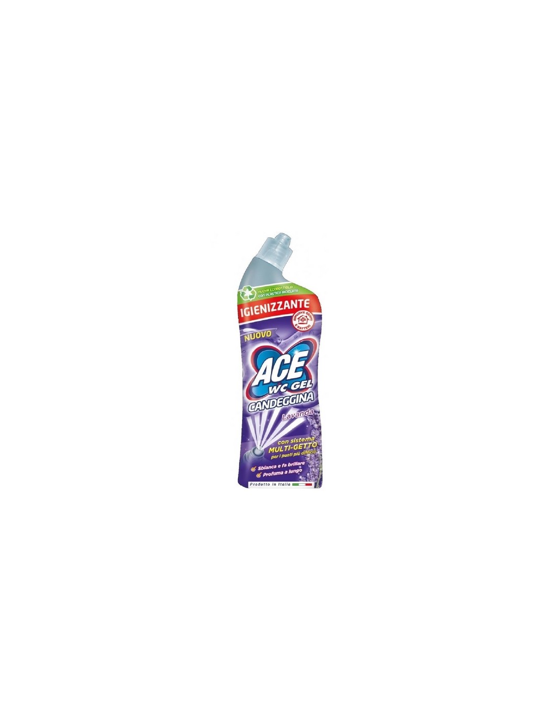 ACE WC Gel Candeggina Lavanda, grazie all’azione dell’ipoclorito igienizza il WC in profondità rimuovendo germi e batteri, e da oggi con i suoi sentori floreali ti dona un bagno non solo pulito, ma anche profumato.