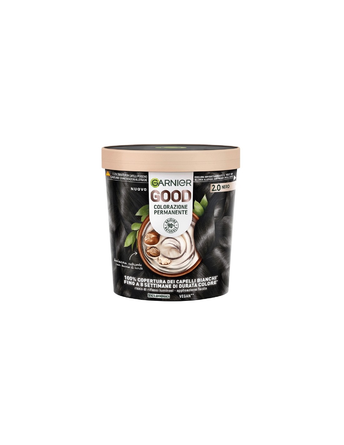 Nuovo Garnier GOOD, colorazione per capelli permanente senza ammoniaca, 90% di origine naturale, copre il 100% dei capelli bianchi. Texture che non cola, si applica facilmente come una maschera e ha una fragranza delicata. Infonde profondamente i pigmenti e dura per 8 settimane donando un aspetto sano al capello e uno splendido effetto intensamente luminoso.