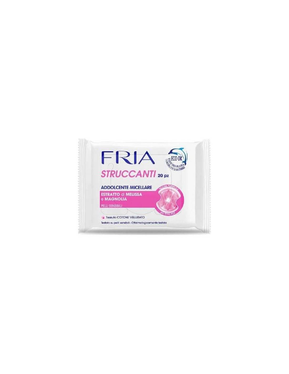 Le nuovissime salviette FRIA STRUCCANTI – ADDOLCENTE MICELLARE sono state studiate per struccare facilmente e delicatamente le pelli più sensibili e irritabili. La formula è stata arricchita con Estratto di Melissa ricco di acido rosmarinico dalle proprietà addolcenti, con estratto di Eufrasia dalle proprietà rinfrescanti, con estratto di Camomilla biologica per donare un piacevole sollievo ed estratto di Magnolia per agevolare la pulizia delle zone più delicate del viso come quelle oculari.