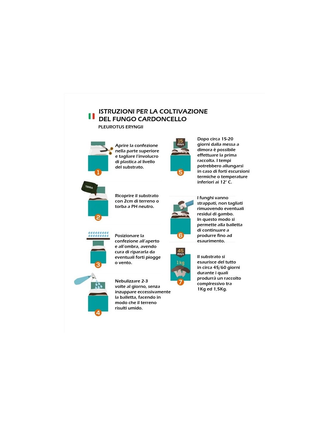 - Manutenzione Minima: Non devi essere un esperto di giardinaggio per avere successo con la coltivazione dei funghi Cardoncelli. Il nostro panetto è progettato per richiedere una manutenzione minima, rendendo la coltivazione dei funghi un'esperienza senza stress. Basta un po' d'acqua e un ambiente adatto, e sarai sulla strada giusta per una ricca raccolta.